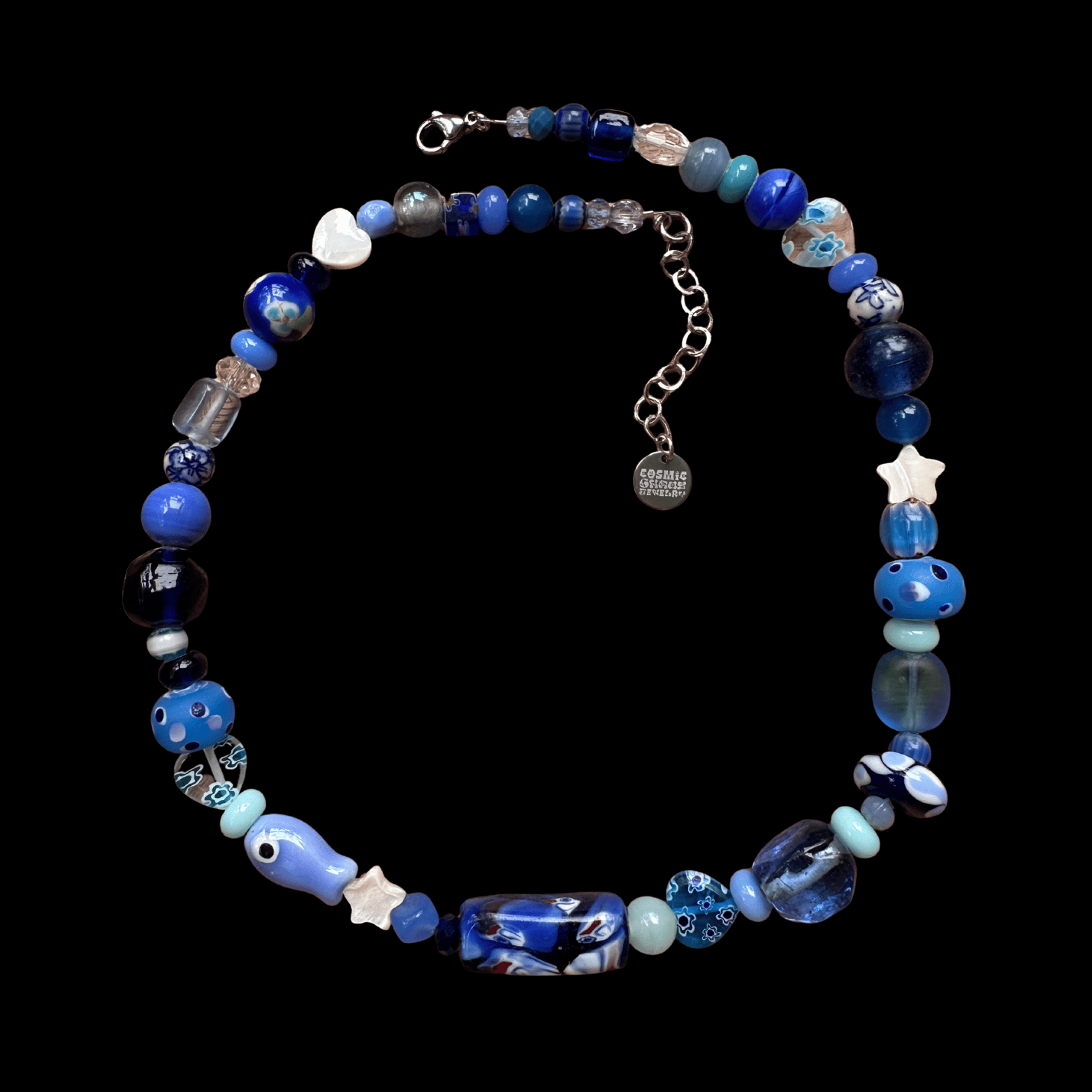 Shell, lamp work, glass, vintage glass, and hand-painted vintage porcelain beads with stainless steel hardware. 18 1/2, with 2in extender.