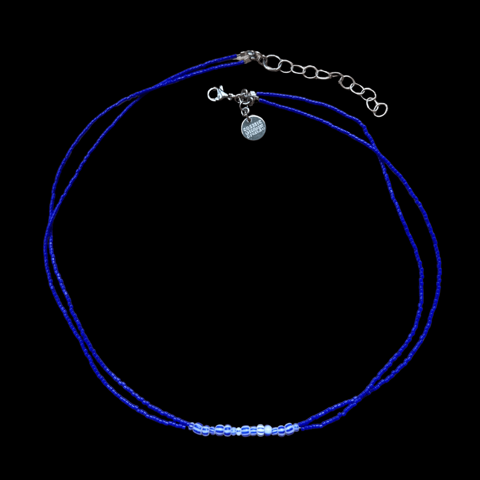 All glass beads with stainless steel hardware. 19in with 2in extender.