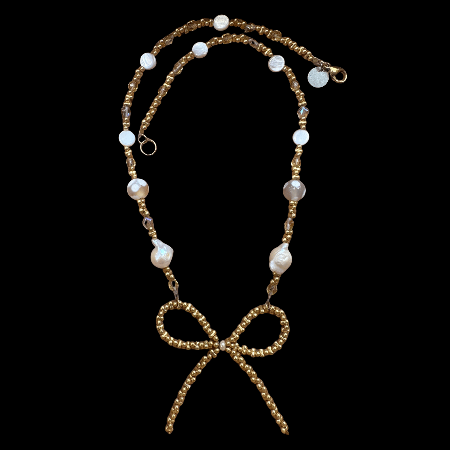 Glass, shell, baked cherry agate, and baroque pearls. 20 1/2in with gold-plated hardware.