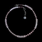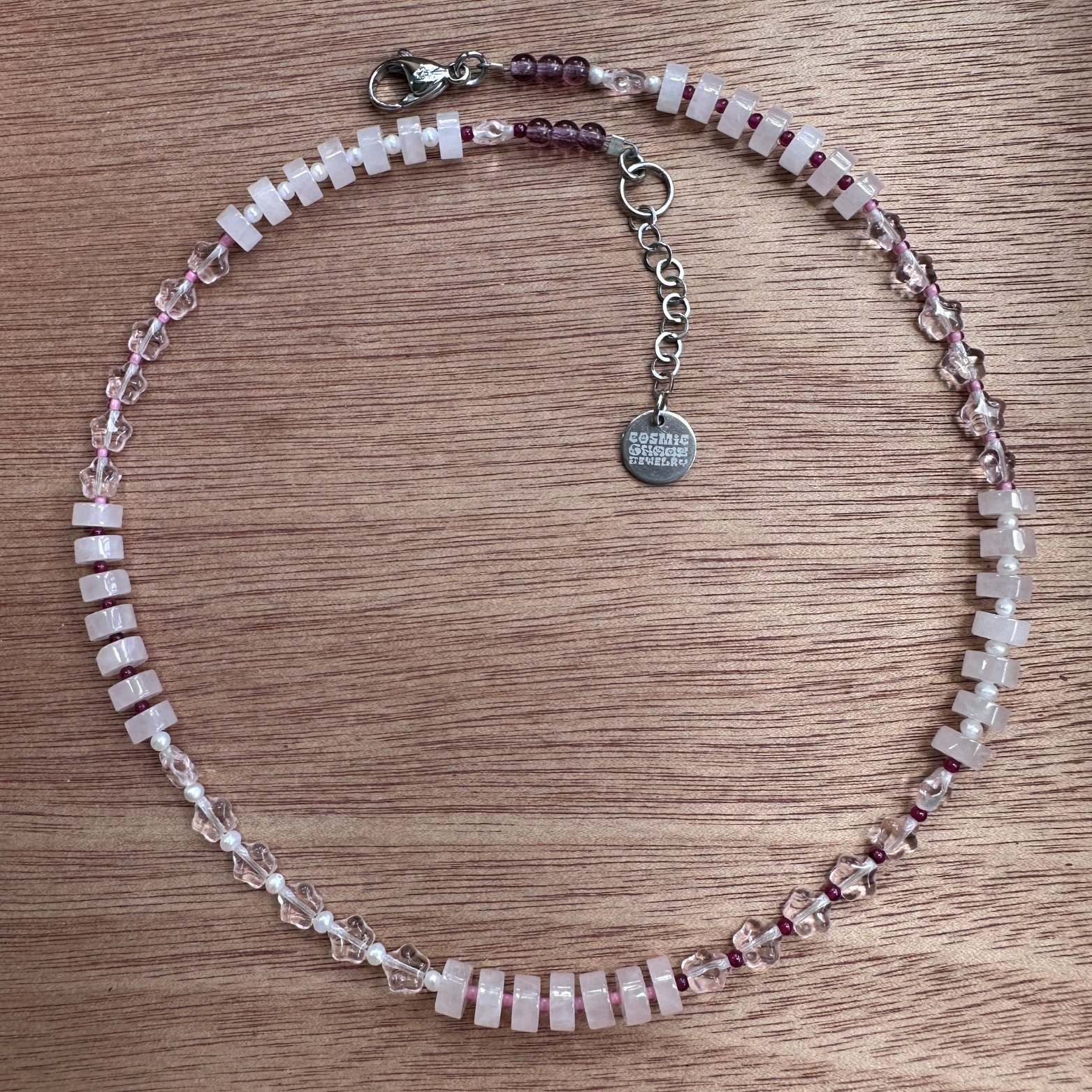 Rose quartz, garnet, and glass beads with stainless steel findings. 17" with 1 1/2" extender.